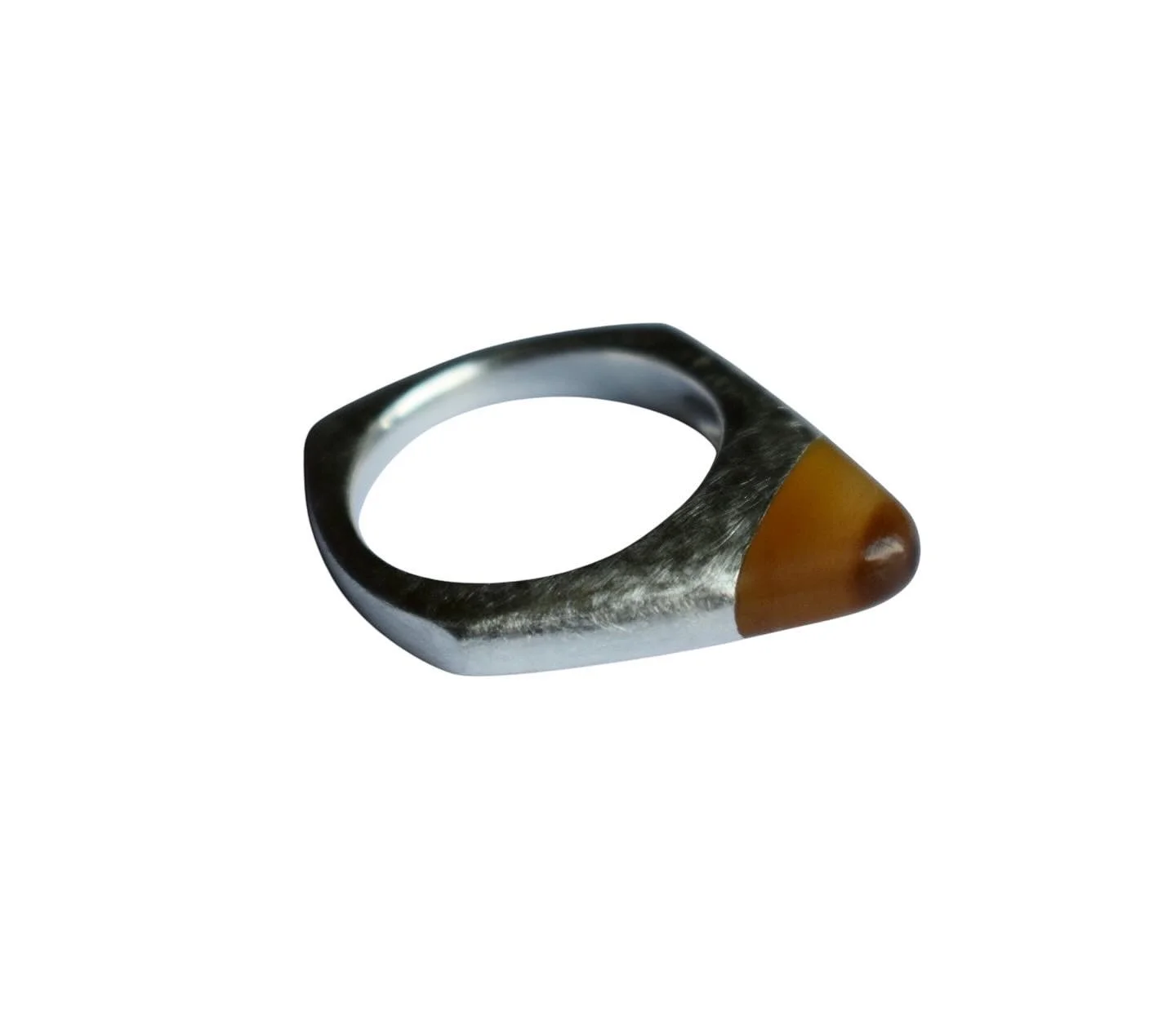 View fullsize I’ve decided to call this little beaut ‘Amber’ as the cow horn set on the top of the recycled silver base resembles the gorgeous fossilised tree resin that it’s named after 🧡🦟 inspired and influenced by medieval stirrup ring